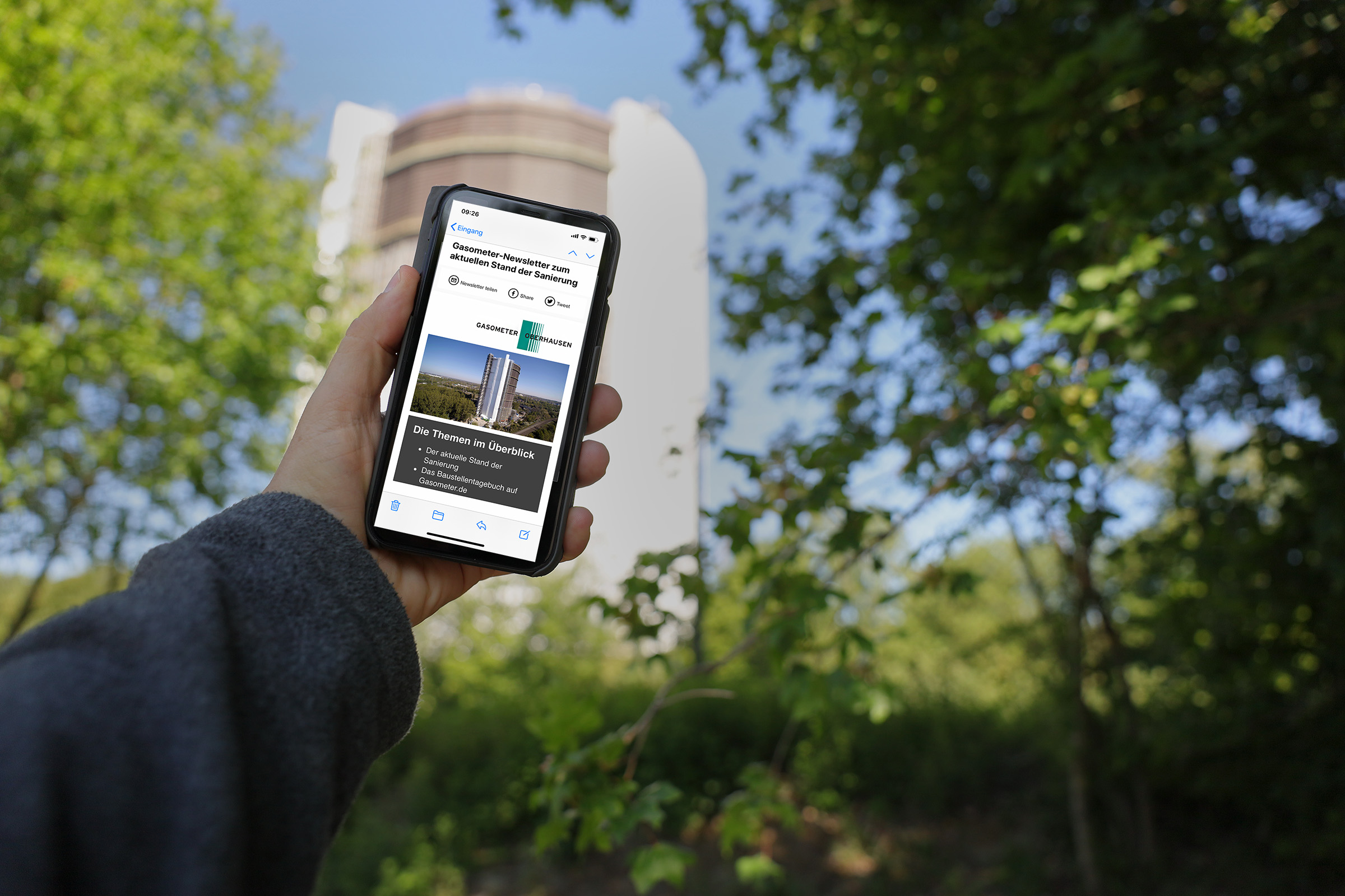 Der Gasometer-Newsletter enthält kurze Berichte, Fotos und Videos zu den wichtigsten Neuigkeiten rund um die höchste Ausstellungshalle Europas.